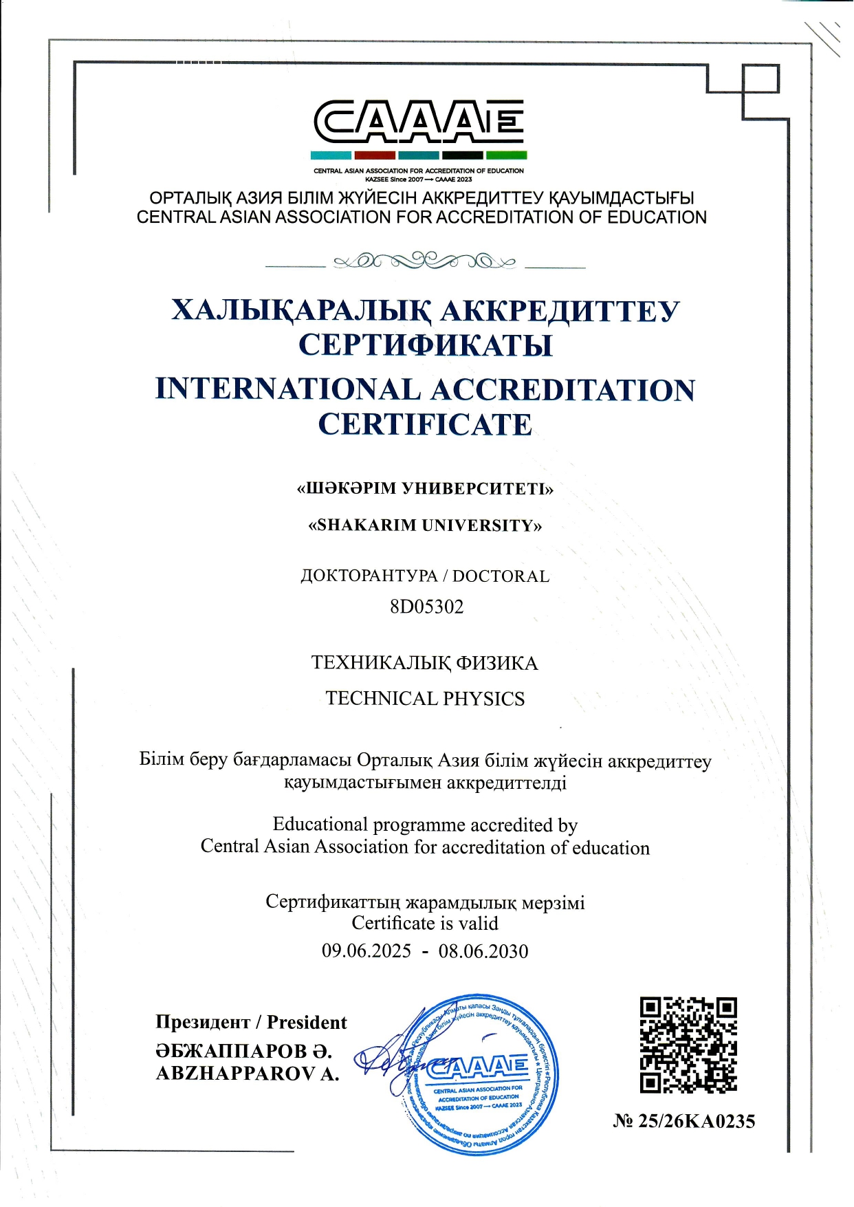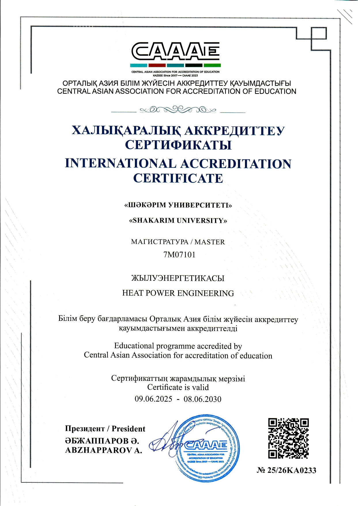 Сондай-ақ, 6B07103 - Жылу энергетикасы білім беру бағдарламасы Еуропадағы инженерлік білім берудің ең жоғары стандарттарына сәйкес келетінін ресми түрде растайтын беделді еуропалық сапа белгісі EUR-ACE®️ алғанын атап өткен жөн.
